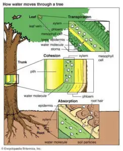 - Leaves: Host photosynthesis and transpiration; stomata regulate water loss, and leaves may drop in drought.